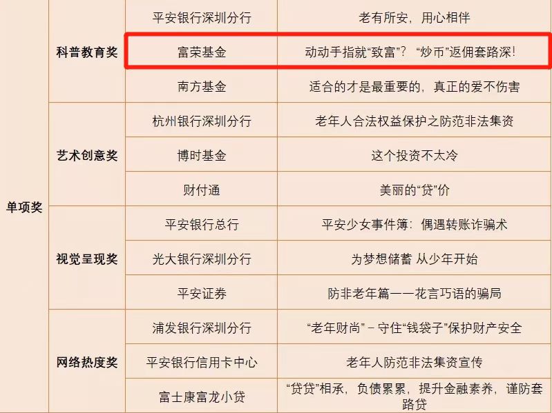 2022年6月,由富榮基金制作、督察長(zhǎng)任曉偉傾情出演的投教短視頻《動(dòng)動(dòng)手指就“致富”?“炒幣”返傭套路深!》在“深圳市居民金融素養(yǎng)提升短視頻大賽”中,斬獲二等獎(jiǎng)及科普類教育獎(jiǎng)兩項(xiàng)榮譽(yù)。